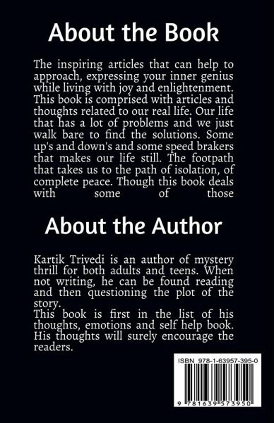 This book is a self help book dealing with the most common topics and problems of our daily life. It has chapters, articles, reports, quotes, poems, and real stories to motivate dear readers. The inspiring articles that can help to approach, expressing your inner genius while living with joy and enlightenment. This book is comprised with articles and thoughts related to our real life. Our life that has a lot of problems and we just walk bare to find the solutions. Some up's and down's and some speed brakers that makes our life still. The footpath that takes us to the path of isolation, of complete peace. Though this book deals with some of those This book also comprises of author's life expirience alsk. Please read to know how it influence you?