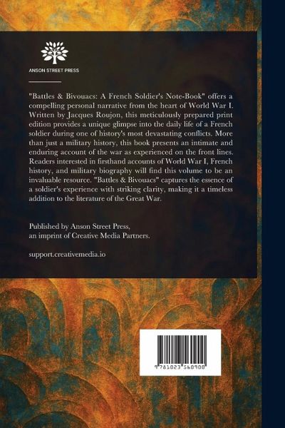 "Battles & Bivouacs: A French Soldier's Note-Book" offers a compelling personal narrative from the heart of World War I. Written by Jacques Roujon, this meticulously prepared print edition provides a unique glimpse into the daily life of a French soldier during one of history's most devastating conflicts. More than just a military history, this book presents an intimate and enduring account of the war as experienced on the front lines. Readers interested in firsthand accounts of World War I, French history, and military biography will find this volume to be an invaluable resource. "Battles & Bivouacs" captures the essence of a soldier's experience with striking clarity, making it a timeless addition to the literature of the Great War. This work has been selected by scholars as being culturally important, and is part of the knowledge base of civilization as we know it. This work is in the public domain in the United States of America, and possibly other nations. Within the United States, you may freely copy and distribute this work, as no entity (individual or corporate) has a copyright on the body of the work. Scholars believe, and we concur, that this work is important enough to be preserved, reproduced, and made generally available to the public. We appreciate your support of the preservation process, and thank you for being an important part of keeping this knowledge alive and relevant.