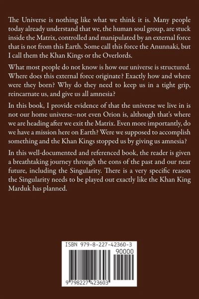 The Universe is nothing like what we think it is. Many people today already understand that we, the human soul group, are stuck inside the Matrix, controlled and manipulated by an external force that is not from this Earth. Some call this force the Anunnaki, but I call them the Khan Kings or the Overlords. What most people do not know is how our universe is structured. Where does this external force originate? Exactly how and where were they born? Why do they need to keep us in a tight grip, reincarnate us, and give us all amnesia? In this book, I provide evidence of that the universe we live in is not our home universe--not even Orion is, although that's where we are heading after we exit the Matrix. Even more importantly, do we have a mission here on Earth? Were we supposed to accomplish something and the Khan Kings stopped us by giving us amnesia? In this well-documented and referenced book, the reader is given a breathtaking journey through the eons of the past and our near future, including the Singularity. There is a very specific reason why the Singularity needs to be played out exactly like the Khan King Marduk has planned.