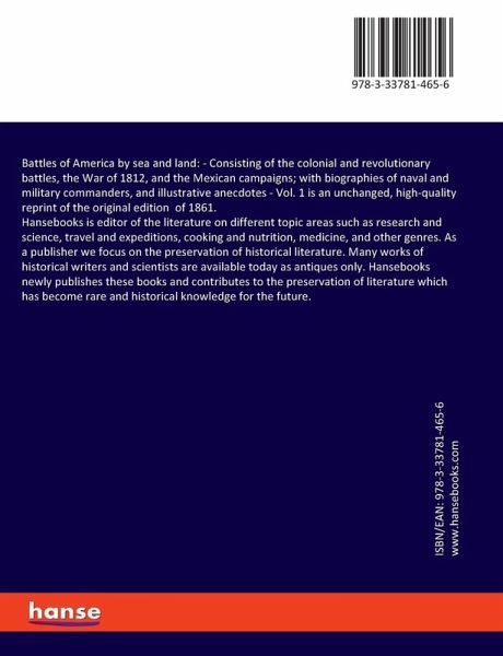 Battles of America by sea and land: - Consisting of the colonial and revolutionary battles, the War of 1812, and the Mexican campaigns; with biographies of naval and military commanders, and illustrative anecdotes - Vol. 1 is an unchanged, high-quality reprint of the original edition of 1861.Hansebooks is editor of the literature on different topic areas such as research and science, travel and expeditions, cooking and nutrition, medicine, and other genres. As a publisher we focus on the preservation of historical literature. Many works of historical writers and scientists are available today as antiques only. Hansebooks newly publishes these books and contributes to the preservation of literature which has become rare and historical knowledge for the future.