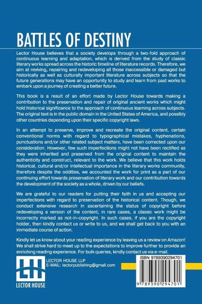 Battles Of Destiny This book is a result of an effort made by us towards making a contribution to the preservation and repair of original classic literature. In an attempt to preserve, improve and recreate the original content, we have worked towards: 1. Type-setting & Reformatting: The complete work has been re-designed via professional layout, formatting and type-setting tools to re-create the same edition with rich typography, graphics, high quality images, and table elements, giving our readers the feel of holding a 'fresh and newly' reprinted and/or revised edition, as opposed to other scanned & printed (Optical Character Recognition - OCR) reproductions. 2. Correction of imperfections: As the work was re-created from the scratch, therefore, it was vetted to rectify certain conventional norms with regard to typographical mistakes, hyphenations, punctuations, blurred images, missing content/pages, and/or other related subject matters, upon our consideration. Every attempt was made to rectify the imperfections related to omitted constructs in the original edition via other references. However, a few of such imperfections which could not be rectified due to intentional\unintentional omission of content in the original edition, were inherited and preserved from the original work to maintain the authenticity and construct, relevant to the work. We believe that this work holds historical, cultural and/or intellectual importance in the literary works community, therefore despite the oddities, we accounted the work for print as a part of our continuing effort towards preservation of literary work and our contribution towards the development of the society as a whole, driven by our beliefs. We are grateful to our readers for putting their faith in us and accepting our imperfections with regard to preservation of the historical content. HAPPY READING!