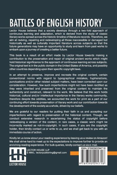 Battles Of English History This book is a result of an effort made by us towards making a contribution to the preservation and repair of original classic literature. In an attempt to preserve, improve and recreate the original content, we have worked towards: 1. Type-setting & Reformatting: The complete work has been re-designed via professional layout, formatting and type-setting tools to re-create the same edition with rich typography, graphics, high quality images, and table elements, giving our readers the feel of holding a 'fresh and newly' reprinted and/or revised edition, as opposed to other scanned & printed (Optical Character Recognition - OCR) reproductions. 2. Correction of imperfections: As the work was re-created from the scratch, therefore, it was vetted to rectify certain conventional norms with regard to typographical mistakes, hyphenations, punctuations, blurred images, missing content/pages, and/or other related subject matters, upon our consideration. Every attempt was made to rectify the imperfections related to omitted constructs in the original edition via other references. However, a few of such imperfections which could not be rectified due to intentional\unintentional omission of content in the original edition, were inherited and preserved from the original work to maintain the authenticity and construct, relevant to the work. We believe that this work holds historical, cultural and/or intellectual importance in the literary works community, therefore despite the oddities, we accounted the work for print as a part of our continuing effort towards preservation of literary work and our contribution towards the development of the society as a whole, driven by our beliefs. We are grateful to our readers for putting their faith in us and accepting our imperfections with regard to preservation of the historical content. HAPPY READING!