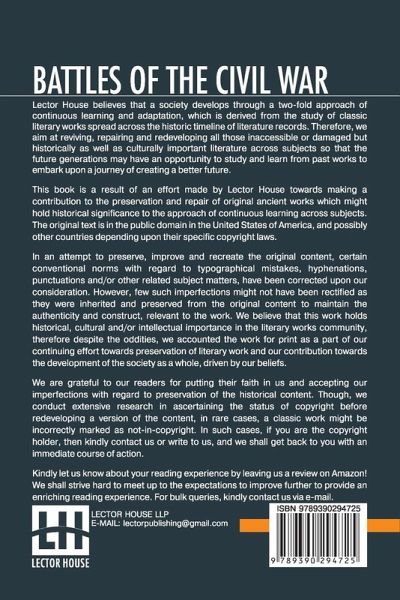 Battles Of The Civil War This book is a result of an effort made by us towards making a contribution to the preservation and repair of original classic literature. In an attempt to preserve, improve and recreate the original content, we have worked towards: 1. Type-setting & Reformatting: The complete work has been re-designed via professional layout, formatting and type-setting tools to re-create the same edition with rich typography, graphics, high quality images, and table elements, giving our readers the feel of holding a 'fresh and newly' reprinted and/or revised edition, as opposed to other scanned & printed (Optical Character Recognition - OCR) reproductions. 2. Correction of imperfections: As the work was re-created from the scratch, therefore, it was vetted to rectify certain conventional norms with regard to typographical mistakes, hyphenations, punctuations, blurred images, missing content/pages, and/or other related subject matters, upon our consideration. Every attempt was made to rectify the imperfections related to omitted constructs in the original edition via other references. However, a few of such imperfections which could not be rectified due to intentional\unintentional omission of content in the original edition, were inherited and preserved from the original work to maintain the authenticity and construct, relevant to the work. We believe that this work holds historical, cultural and/or intellectual importance in the literary works community, therefore despite the oddities, we accounted the work for print as a part of our continuing effort towards preservation of literary work and our contribution towards the development of the society as a whole, driven by our beliefs. We are grateful to our readers for putting their faith in us and accepting our imperfections with regard to preservation of the historical content. HAPPY READING!