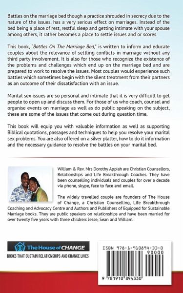 Battles on the marriage bed though a practice shrouded in secrecy due to the nature of the issues, have a very serious effect on marriages. They sometimes start with misunderstandings and disagreements about issues and then explodes into anger on the bed if and when not resolved. Instead of the bed being a place of rest, restful sleep and getting intimate with your spouse, it rather becomes a place to settle issues and or scores. This book is written to inform and educate couples about the relevance of settling conflicts in the marriage and the need to do so without a peace keeping force. We always jokingly state that the United Nations is overburdened with various urgent and serious problems in the world and have fewer resources to divert some into settling marriage issues with their peace keeping force. Couples will do well to settle marital conflicts by themselves. Some families genuinely may want to settle their differences out of the bed. This book, Battles On The Marriage Bed, is for those who recognize the existence of the problems and challenges which end up in the marriage bed and are prepared to work to resolve the issue. Most couples would experience such battles which sometimes begin with the silent treatment from their partners as an outcome of their dissatisfaction with an issue. This can be due to several factors including infidelity, health, stress and psychological factors. Issues about marital sex are so personal and intimate that it is very difficult to get people to open up and discuss them. For those of us who coach, counsel and organise events on marriage as well as do public speaking, these are some of the issues that come out during question time. People get excited when you raise issues about sex at any event, as they have the opportunity to either contribute or listen to advice, guidance, and information.