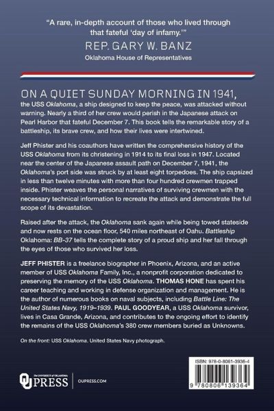 On a quiet Sunday morning in 1941, a ship designed to keep the peace was suddenly attacked. This book tells the remarkable story of a battleship, its brave crew, and how their lives were intertwined. Jeff Phister and his coauthors have written the comprehensive history of the USS Oklahoma from its christening in 1914 to its final loss in 1947. Phister tells how the Oklahoma served in World War I, participated in the Great Cruise of 1925, and evacuated refugees from Spain in 1936. But the most memorable event of the ship’s history occurred on December 7, 1941. Phister weaves the personal narratives of surviving crewmen with the necessary technical information to recreate the attack and demonstrate the full scope of its devastation. Captured Japanese photographs and dozens of historic U.S. Navy photographs deepen our understanding of this monumental event. Raised after the attack, the Oklahoma sank again while being towed stateside and now rests on the ocean floor, 540 miles northeast of Oahu. Battleship Oklahoma: BB-37 tells the complete story of a proud ship and her fall through the eyes of those who survived her loss.