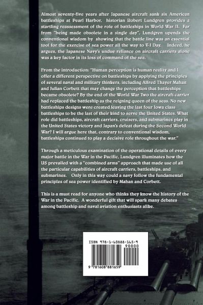 Almost seventy-five years after the Japanese sank six US battleships at Pearl Harbor, Historian Robert Lundgren provides a startling reassessment of the role of battleships in World War II. Far from "being made obsolete in a single day", Lundgren upends the conventional wisdom by showing that the battle line was an essential tool for the exercise of seapower all the way to V-J Day. Indeed, he argues, the Japanese Navy's undue reliance on aircraft carriers alone was a key factor in its loss of command of the sea. From the introduction: "Human perception is human reality and I offer a different perspective on battleships by applying the principles of several naval and military thinkers, including Alfred Thayer Mahan and Julian Corbett that may change the perception that battleships became obsolete? By the end of the World War Two the aircraft carrier had replaced the battleship as the reigning queen of the seas. No new battleships designs were created leaving the last four Iowa class battleships to be the last of their kind to serve the United States. What role did battleships, aircraft carriers, cruisers, and submarines play in the United States victory and Japan's defeat during the Second World War? I will argue here that, contrary to conventional wisdom, battleships continued to play a decisive role throughout the war." Through a meticulous examination of the operational details of every major battle in the War in the Pacific, Lundgren illuminates how the US prevailed with a "combined arms" approach that made use of all the particular capabilities of aircraft carriers, battleships, and submarines. Only in this way could a navy follow the fundamental principles of sea power identified by Mahan and Corbett. This is a must read for anyone who thinks they know the history of the War in the Pacific. A wonderful gift that will spark many debates among battleship and naval aviation enthusiasts alike. Robert Lundgren is also the author of The World Wonder'd: What Really Happened Off Samar (Nimble 2014). Eight tables, 700 footnotes.