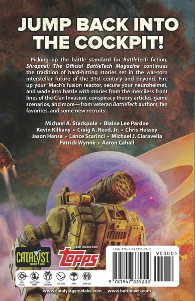 JUMP BACK INTO THE COCKPIT! Picking up the battle standard for BattleTech fiction, Shrapnel: The Official BattleTech Magazine continues the tradition of hard-hitting stories set in the war-torn interstellar future of the 31st century and beyond. Fire up your 'Mech's fusion reactor, secure your neurohelmet, and wade into battle with stories from the merciless front lines of the Clan Invasion and other eras, conspiracy theory articles, game scenarios, and more from veteran BattleTech authors, fan favorites, and some new recruits. Featuring: Michael A. Stackpole Blaine Lee Pardoe Kevin Killiany Craig A. Reed, Jr. Chris Hussey Jason Hansa Lance Scarinci Michael J. Ciaravella Patrick Wynne Aaron Cahall