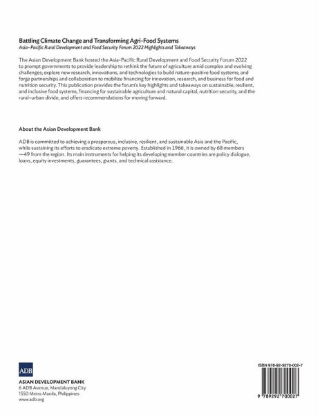 This publication provides key highlights and takeaways from the Asia-Pacific Rural Development and Food Security Forum 2022 on four main areas: sustainable, resilient, and inclusive food systems; financing for sustainable agriculture and natural capital; nutrition security; and the rural-urban divide. The publication shares insights from the forum to support policymakers in rethinking the future of agriculture amid complex and evolving challenges; exploring new research, innovations, and technologies to build nature-positive food systems; and in forging partnerships to mobilize financing for food and nutrition security. It includes recommendations for moving forward.