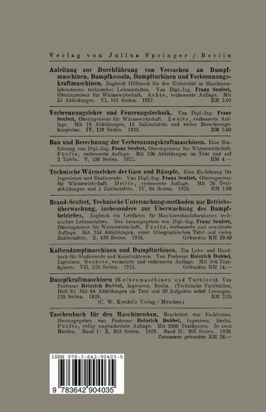 Erster Teil. Wirkungsweise der Dampfturbinen..- I. Allgemeines.- II. Wirkung des Dampfes auf die Laufradschaufel.- III. Unterschied zwischen Gleichdruck- und Überdruckturbine.- IV. Mehrstufige Turbinen.- Zweiter Teil. Aufbau der Dampfturbinen..- I. Allgemeines.- II. Hauptteile.- Dritter Teil. Berechnung der Dampfturbinen..- I. Formeln aus der Warmelehre des Wasserdampfes.- II. Die Lavalsche Düse.- III. Energie-Umsatz im Laufrad.- Vierter Teil. Berechnung wichtiger Einzelteile..- I. Welle..- II. Laufrad.- Fünfter Teil. Turbinen für besondere Zwecke..- I. Abdampfturbinen.- II. Gegendruckturbinen.- II. Schiffsturbinen.