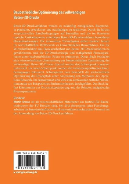 Beton-3D-Druckverfahren werden es zukünftig ermöglichen, Bauprozesse planbarer, produktiver und nachhaltiger zu realisieren. Durch die höchst anspruchsvollen Randbedingungen auf Baustellen und die im Bauwesen typische Unikatbauweise unterliegen Beton-3D-Druckverfahren besonderen Herausforderungen. Die innovativen Technologien stehen darüber hinaus im wirtschaftlichen Wettbewerb zu konventionellen Bauverfahren. Um die Wirtschaftlichkeit und Prozesssicherheit von Beton-3D-Druckverfahren zu gewährleisten, sind die 3D-Druckstrategie und maßgebende Prozessparameter unter baubetrieblichem Fokus zu optimieren. Dieses Buch beinhaltet eine wissenschaftliche Untersuchung zur baubetrieblichen Optimierung des vollwandigen Beton-3D-Drucks. Speziell werden drei Schwerpunkte genauer untersucht. Im ersten Schwerpunkt werden die verfahrensspezifischen Randbedingungen fokussiert. Schwerpunkt zwei behandelt die wirtschaftliche Optimierung des Druckpfads unter Anwendung von Methoden des Operations Research. Im Schwerpunkt drei wird eine umfassende zeitliche Simulationsstudie am Beispiel eines Einfamilienhauses durchgeführt. Das Buch liefert Erkenntnisse zur Druckzeitoptimierung und der Relation maßgebender Prozessparameter.