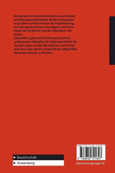 Baubetrieb ist Unternehmensleitung und daher eine Managementaufgabe. Moderne Baupraxis muß daher auf Kenntnissen der Projektleitung, auf vertragsrechtlichen Grundlagen, auf Kenntnissen der Verfahren und der Kalkulation aufbauen Dieses Werk gibt eine Einführung und einen umfassenden Überblick. Der Autor beschränkt die Ausführungen auf das Wesentliche und ermöglicht dem Leser damit, schnell die grundlegenden Elemente erfassen zu können.