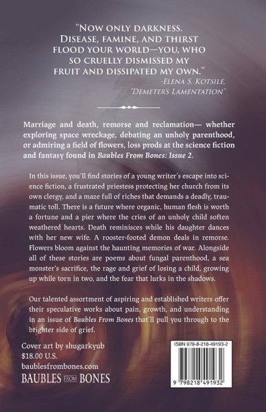 Marriage and death, remorse and reclamation- whether exploring space wreckage, debating an unholy parenthood, or admiring a field of flowers, loss prods at the science fiction and fantasy found in Baubles From Bones: Issue 2. In this issue, you'll find stories of a young writer's escape into science fiction, a frustrated priestess protecting her church from its own clergy, and a maze full of riches that demands a deadly, traumatic toll. There is a future where organic, human flesh is worth a fortune and a pier where the cries of an unholy child soften weathered hearts. Death reminisces while his daughter dances with her new wife. A rooster-footed demon deals in remorse. Flowers bloom against the haunting memories of war. Alongside all of these stories are poems about fungal parenthood, a sea monster's sacrifice, the rage and grief of losing a child, growing up while torn in two, and the fear that lurks in the shadows. Our talented assortment of aspiring and established writers offer their speculative works about pain, growth, and understanding in an issue of Baubles From Bones that'll pull you through to the brighter side of grief.