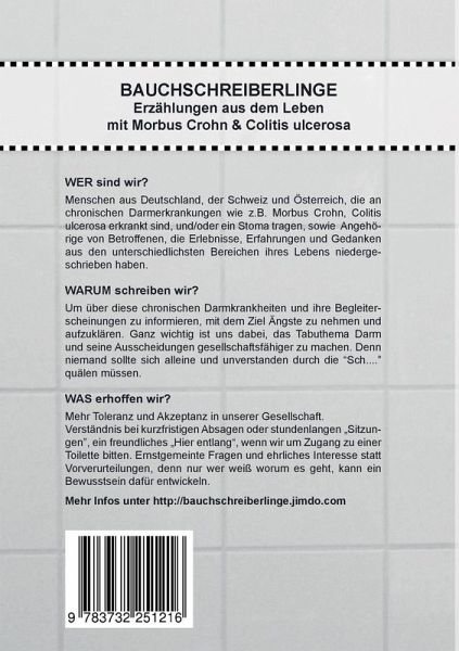 WER sind wir?Menschen aus Deutschland, der Schweiz und Österreich, die an chronischen Darmerkrankungen wie z.B. Morbus Crohn, Colitis ulcerosa erkrankt sind, und/oder ein Stoma tragen, sowie Angehörige von Betroffenen, die Erlebnisse, Erfahrungen und Gedanken aus den unterschiedlichsten Bereichen ihres Lebens niedergeschrieben haben.WARUM schreiben wir?Um über diese chronischen Darmkrankheiten und ihre Begleiterscheinungen zu informieren, mit dem Ziel, Ängste zu nehmen und aufzuklären. Ganz wichtig ist uns dabei, das Tabuthema Darm und seine Ausscheidungen gesellschaftsfähiger zu machen. Denn niemand sollte sich alleine und unverstanden durch die "Sch...." quälen müssen. WAS erhoffen wir? Mehr Toleranz und Akzeptanz in unserer Gesellschaft.Verständnis bei kurzfristigen Absagen oder stundenlangen "Sitzungen", Ein freundliches "Hier entlang", wenn wir um Zugang zu einer Toilette bitten. Ernstgemeinte Fragen und ehrliches Interesse statt Vorverurteilungen, denn nur wer weiß worum es geht, kann ein Bewusstsein dafür entwickeln.