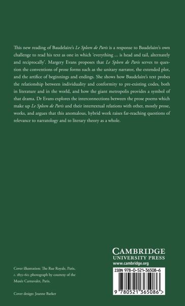 This 1993 reading of Baudelaire's Le Spleen de Paris is a response to Baudelaire's own challenge to read his text as one in which 'everything ... is head and tail, alternately and reciprocally'. Margery Evans proposes that Le Spleen de Paris serves to question the conventions of prose forms such as the unitary narrator, the extended plot, and the artifice of beginnings and endings. She shows how Baudelaire's text probes the relationship between individuality and conformity to pre-existing codes, both in literature and in the world, and how the giant metropolis provides a symbol of that drama. Dr Evans explores the interconnections between the prose poems which make up Le Spleen de Paris and their intertextual relations with other, mostly prose, works, and argues that this anomalous, hybrid work raises far-reaching questions of relevance to narratology and to literary theory as a whole.