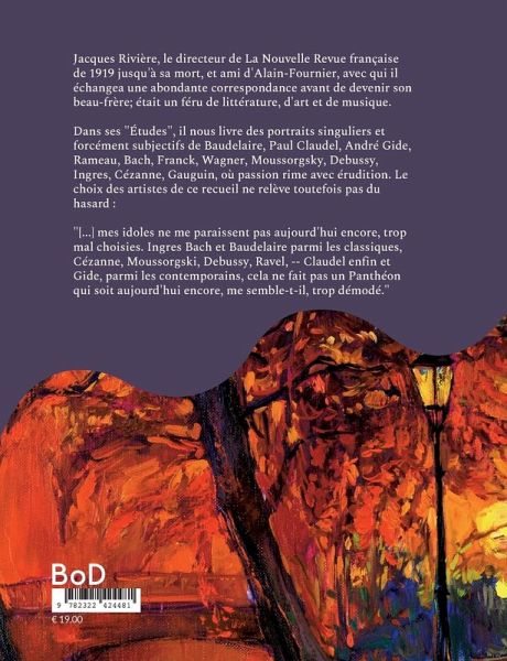 Jacques Rivière, le directeur de La Nouvelle Revue française de 1919 jusqu'à sa mort, et ami d'Alain-Fournier, avec qui il échangea une abondante correspondance avant de devenir son beau-frère; était un féru de littérature, d'art et de musique.Dans ses "Études", il nous livre des portraits singuliers et forcément subjectifs de Baudelaire, Paul Claudel, André Gide, Rameau, Bach, Franck, Wagner, Moussorgsky, Debussy, Ingres, Cézanne, Gauguin, où passion rime avec érudition. Le choix des artistes de ce recueil ne relève toutefois pas du hasard : "[...] mes idoles ne me paraissent pas aujourd'hui encore, trop mal choisies. Ingres Bach et Baudelaire parmi les classiques, Cézanne, Moussorgski, Debussy, Ravel, -- Claudel enfin et Gide, parmi les contemporains, cela ne fait pas un Panthéon qui soit aujourd'hui encore, me semble-t-il, trop démodé."
