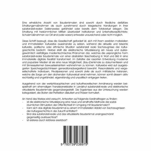 Die kulturpolitische Situation zeigt deutlich, dass eine erhebliche Anzahl von Baudenkmalen vor dem drohenden substanziellen Verlust steht. Realistisch betrachtet, kann nur der geringere Teil der substanziell-realen, baulich-räumlichen, im Interesse der Öffentlichkeit stehenden Zeugnisse der Kulturgeschichte mit entsprechenden Schutzmaßnahmen der Nachwelt erhalten werden. Denkmalschutz und Denkmalpflege sind geprägt durch erhebliche Defizite im Wertbewusstsein, in unzureichenden wirtschaftlichen und finanziellen Möglichkeiten zur Erhaltung von Baudenkmalen sowie durch das Fehlen adäquater Nachnutzungen des historischen Bestandes. Mit "Virtueller Realität" wird das neue und außergewöhnlich vielfältige Phänomen bezeichnet, das z. B. die Frage nach der ursprünglichen Form des substanziell-realen Baudenkmals angeblich zu beantworten vermag, tatsächlich aber es von einer abstrakten Beschreibung in Wort und Bild in eine immaterielle Realität transformiert. Mit virtuellen Darstellungen ist man in der Lage, Forschungsergebnisse zu präsentieren, auch ein realistisches Abbild gegenwärtiger oder vergangener Zustände eines Baudenkmals zu vermitteln.