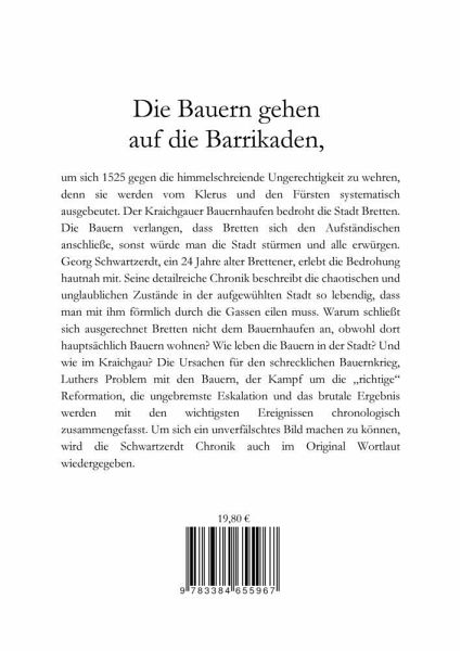 Die Bauern gehen auf die Barrikaden, um sich 1524/25 gegen die himmelschreiende Ungerechtigkeit zu wehren, denn sie werden vom Klerus und den Fürsten systematisch ausgebeutet. Auch die Stadt Bretten wird vom Kraichgauer Bauernhaufen bedroht. Die Bauern verlangen, dass sich Bretten den Aufständischen anschließt, ansonsten würde man die Stadt stürmen und alle erwürgen. Georg Schwartzerdt, ein 24 Jahre alter Brettener, erlebt die Bedrohung hautnah mit. Seine detailreiche Chronik beschreibt die chaotischen und unglaublichen Zustände in der aufgewühlten Stadt so lebendig, dass man mit ihm zusammen durch die Gassen eilen muss. Warum schließt sich ausgerechnet Bretten nicht dem Bauernhaufen an, obwohl dort hauptsächlich Bauern wohnen? Wovon leben die Bauern überhaupt? Die Ursachen für den schrecklichen Bauernkrieg, Luthers Problem mit den Bauern, der Kampf um die "richtige" Reformation, die ungebremste Eskalation und das brutale Ergebnis werden chronologisch mit den wichtigsten Ereignissen zusammen gefasst. Um sich ein unverfälschtes Bild machen zu können, wird die Schwartzerdt Chronik auch im originalen Wortlaut wiedergegeben.