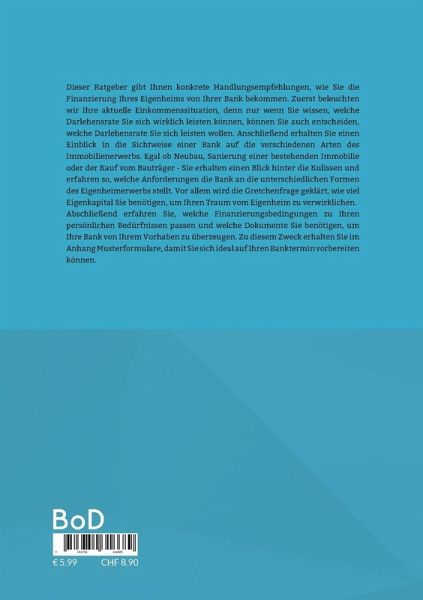 Dieser Ratgeber gibt Ihnen konkrete Handlungsempfehlungen, wie Sie die Finanzierung Ihres Eigenheims von Ihrer Bank bekommen. Zuerst beleuchten wir Ihre aktuelle Einkommenssituation, denn nur wenn Sie wissen, welche Darlehensrate Sie sich wirklich leisten können, können Sie auch entscheiden, welche Darlehensrate Sie sich leisten wollen. Anschließend erhalten Sie einen Einblick in die Sichtweise einer Bank auf die verschiedenen Arten des Immobilienerwerbs. Egal ob Neubau, Sanierung einer bestehenden Immobilie oder der Kauf vom Bauträger - Sie erhalten einen Blick hinter die Kulissen und erfahren so, welche Anforderungen die Bank an die unterschiedlichen Formen des Eigenheimerwerbs stellt. Vor allem wird die Gretchenfrage geklärt, wie viel Eigenkapital Sie benötigen, um Ihren Traum vom Eigenheim zu verwirklichen.Abschließend erfahren Sie, welche Finanzierungsbedingungen zu Ihren persönlichen Bedürfnissen passen und welche Dokumente Sie benötigen, um Ihre Bank von Ihrem Vorhaben zu überzeugen. Zu diesem Zweck erhalten Sie im Anhang Musterformulare, damit Sie sich ideal auf Ihren Banktermin vorbereiten können.