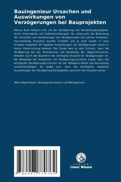 Dieses Buch befasst sich mit der Verzögerung von Verstärkungsprojekten durch Scherwände und Stahlverstrebungen. Es untersucht die Bedeutung der Ursachen und Auswirkungen von Verzögerungen bei solchen Projekten. Vierundvierzig Ursachen wurden ermittelt und je nach Quelle in neun Gruppen eingeteilt. Elf negative Auswirkungen von Verzögerungen waren in dieser Untersuchung bekannt. Die Studie kam zu dem Schluss, dass die Verzögerung bei der Finanzierung und Bezahlung der abgeschlossenen Arbeiten durch den Bauherrn die wichtigste Ursache für Verzögerungen ist. Die Rangfolge der Kategorien von Verzögerungsursachen ergab, dass die wichtigsten Verzögerungsursachen mit der Kategorie Arbeit und Ausrüstung zusammenhängen. Es zeigte sich, dass die wichtigsten negativen Auswirkungen der Verzögerung Streitigkeiten zwischen den Parteien waren.