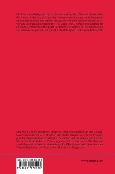 Die Autorin beschäftigt sich mit der Problematik Baulärm. Sie stellt übersichtlich die Probleme dar, die sich aus der momentanen Gesetzes- und Rechtsprechungslage ergeben, und arbeitet heraus, wie willkürlich Gerichte gleiche Sachverhalte unterschiedlich behandeln. Auf Basis Ihrer Untersuchung unterbreitet sie einen Gesetzesvorschlag, der für dauerhafte Klarheit bei der Behandlung von Baulärm sorgen soll und somit für alle Beteiligten Rechtssicherheit schafft.