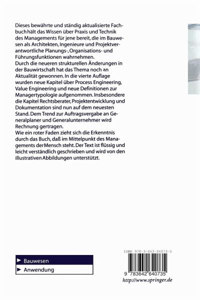 Dieses bewährte und ständig aktualisierte Fachbuch hält das Wissen über Praxis und Technik des Managements für jene bereit, die im Bauwesen als Architekten, Ingenieure und Projektverantwortliche Planungs,- Organisations- und Führungsfunktionen wahrnehmen. Durch die neueren strukturellen Änderungen in der Bauwirtschaft hat das Thema noch an Aktualität gewonnen. In die vierte Auflage wurden neue Kapitel über Process Engineering, Value Engineering und neue Definitionen zur Managertypologie aufgenommen. Insbesondere die Kapitel Rechtsberater, Projektentwicklung und Dokumentation sind nun auf dem neuesten Stand. Dem Trend zur Auftragsvergabe an Generalplaner und Generalunternehmer wird Rechnung getragen. Wie ein roter Faden zieht sich die Erkenntnis durch das Buch, daß im Mittelpunkt des Managements der Mensch steht. Der Text ist flüssig und leicht verständlich geschrieben und wird von illustrativen Abbildungen unterstützt.