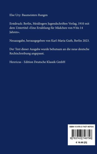 Else Ury: Baumeisters Rangen. Eine Erzählung für Mädchen von 9 bis 14 JahrenErstdruck: Berlin, Meidingers Jugendschriften Verlag, 1910.Neuausgabe, herausgegeben von Karl-Maria Guth, Berlin 2023.Der Text dieser Ausgabe wurde behutsam an die neue deutsche Rechtschreibung angepasst.Gesetzt aus der Minion Pro, 11 pt.Die Sammlung Hofenberg erscheint im Verlag Henricus - Edition Deutsche Klassik GmbH, Berlin