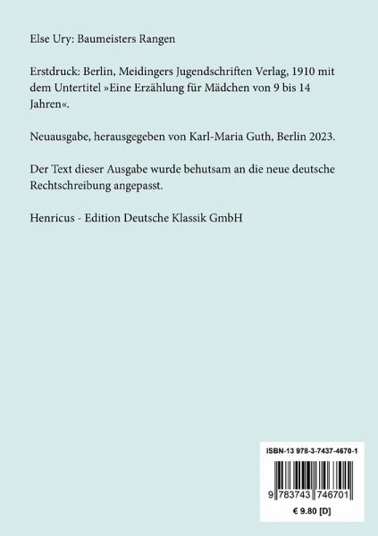 Else Ury: Baumeisters Rangen. Eine Erzählung für Mädchen von 9 bis 14 JahrenErstdruck: Berlin, Meidingers Jugendschriften Verlag, 1910.Neuausgabe, herausgegeben von Karl-Maria Guth, Berlin 2023.Der Text dieser Ausgabe wurde behutsam an die neue deutsche Rechtschreibung angepasst.Gesetzt aus der Minion Pro, 11 pt.Die Sammlung Hofenberg erscheint im Verlag Henricus - Edition Deutsche Klassik GmbH, Berlin