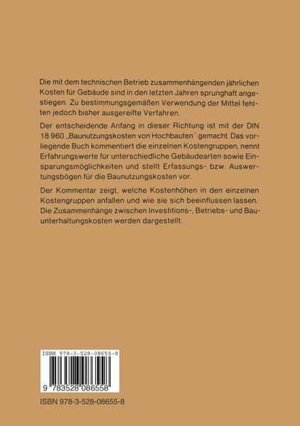 1.1 AniaB zur Aufstellung der neuen Norm "Baunutzungskosten von Hochbauten" (DIN 18960) Bei dem Bemuhen um ein "wirtschaftliches Bauen", im besonderen bei den Kosten analysen von Gebauden, machte sich in zunehmendem MaB das Fehlen einer von allen Beteiligten anwendbaren einheitlichen Gliederung der laufenden Kosten be merkbar, und zwar nicht nur fur deren Kontrolle wahrend der Lebensdauer des Bauwerks, sondern vor allem fur die planerischen Entscheidungen im investiven Be reich. Besonders die Einfuhrung von Kostenrichtwerten lieB bei den am Bau Betei ligten die Erkenntnis reifen, daB das eigentliche Ziel einer Kostenbegrenzung - bei gegebenen Nutzeranforderungen - in der Reduzierung der uber die Nutzungsdauer verteilten gesamten Investitions-und Baunutzungskosten gesehen werden musse. Nachdem bereits die zweite Fassung der DIN 276 "Kosten von Hochbauten" mit ihren drei Blattern "Begriffe", "Gliederung" und .. Kostenermittlung" eingefuhrt ist, war die Inangriffnahme einer entsprechenden Norm fUr die Baunutzungskosten eine langst fallige Konsequenz. Den letzten und nachhaltigsten AnstoB mag der sprung hafte Anstieg der Energiekosten im Gefolge der Energiekrise gegeben haben. Auch der immer geringer werdende Investitionsspielraum, beispielsweise der 6ffentlichen Hand, und der Zwang zur Begrenzung der Bewirtschaftungskosten machten die Ein fuhrung der neuen Norm immer dringender. Nur mit ihrer Hilfe k6nnen die jahrlich wiederkehrenden Milliardenausgaben fUr die Nutzung bestehender Gebaude uber sichtlich und damit kontrollierbar gemacht werden. Dies aber ist eine wesentliche Voraussetzung fur die erforderliche sparsame Bewirtschaftung dieser Mittel. 1.2 Bisherige Beriicksichtigung der zu erwartenden laufenden Kosten Bisher wurden die zu erwartenden laufenden Kosten vor allem im Rahmen von Wi rtschaftl ich keitsbetrachtu ngen berucksichtigt.