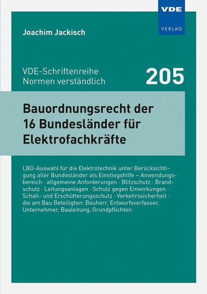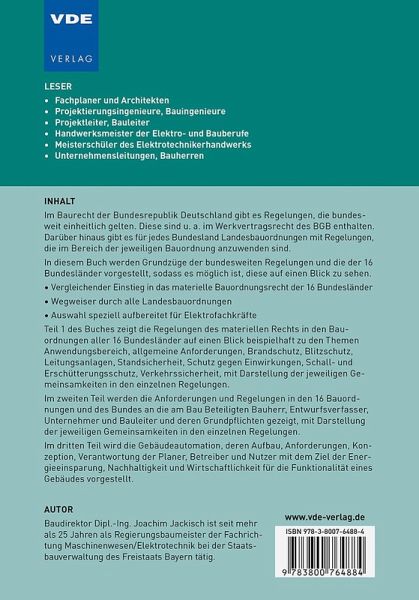 Im Baurecht der Bundesrepublik Deutschland gibt es Regelungen, die bundesweit einheitlich gelten. Diese sind u. a. im Werkvertragsrecht des BGB enthalten. Darüber hinaus gibt es für jedes Bundesland Landesbauordnungen mit Regelungen, die im Bereich der jeweiligen Bauordnung anzuwenden sind.In diesem Buch werden Grundzüge der bundesweiten Regelungen und die der 16 Bundesländer vorgestellt, sodass es möglich ist, diese auf einen Blick zu sehen.- Vergleichender Einstieg in das materielle Bauordnungsrecht der 16 Bundesländer- Wegweiser durch alle Landesbauordnungen- Auswahl speziell aufbereitet für ElektrofachkräfteTeil 1 des Buches zeigt die Regelungen des materiellen Rechts in den Bauordnungen aller 16 Bundesländer auf einen Blick beispielhaft zu den Themen Anwendungsbereich, allgemeine Anforderungen, Brandschutz, Blitzschutz, Leitungsanlagen, Standsicherheit, Schutz gegen Einwirkungen, Schall- und Erschütterungsschutz, Verkehrssicherheit, mit Darstellung der jeweiligen Gemeinsamkeiten in den einzelnen Regelungen.Im zweiten Teil werden die Anforderungen und Regelungen in den 16 Bauordnungen und des Bundes an die am Bau Beteiligten Bauherr, Entwurfsverfasser, Unternehmer und Bauleiter und deren Grundpflichten gezeigt, mit Darstellung der jeweiligen Gemeinsamkeiten in den einzelnen Regelungen.Im dritten Teil wird die Gebäudeautomation, deren Aufbau, Anforderungen, Konzeption, Verantwortung der Planer, Betreiber und Nutzer mit dem Ziel der Energieeinsparung, Nachhaltigkeit und Wirtschaftlichkeit für die Funktionalität eines Gebäudes vorgestellt.