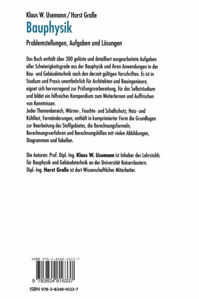 Das Buch enthält über 300 gelöste und detailliert ausgearbeitete Aufgaben aller Schwierigkeitsgrade aus der Bauphysik und ihren Anwendungen in der Bau- und Gebäudetechnik nach den derzeit gültigen Vorschriften. Es ist in Studium und Praxis unentbehrlich für Architekten und Bauingenieure, eignet sich hervorragend zur Prüfungsvorbereitung, für das Selbststudium und bildet ein hilfreiches Kompendium zum Weiterlernen und Auffrischen von Kenntnissen. Jeder Themenbereich, Wärme-, Feuchte- und Schallschutz, Heiz- und Kühllast, Formänderungen, enthält in komprimierter Form die Grundlagen zur Bearbeitung des Stoffgebietes, die Berechnungsformeln, Berechnungsverfahren und Berechnungshilfen mit vielen Abbildungen, Diagrammen und Tabellen.