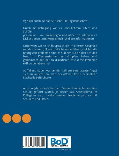 1150 km durch die süddeutsche Bildungslandschaft.Durch die Befragung von ca. 1200 Lehrern, Eltern und Schülernper online, mit Fragebögen und über 200 Interviews /Diskussionen unterwegs erhielt ich diese Informationen.Unterwegs wollte ich hauptsächlich im direkten Gespräch mit den Lehrern, Eltern und Schülern erfahren, welches die häufigsten Probleme sind, mit denen sie an den Schulen bzw. im Klassenzimmer zu kämpfen haben und gemeinsam darüber zu diskutieren, wie diese Probleme evtl. zu beheben sind.Auffallend dabei war bei den Lehrern eine latente Angst sich zu äußern, da man bei offener Kritik persönliche Nachteile befürchtete.Auch zeigte es sich bei den Gesprächen, je besser eine Schule geführt wurde, je besser das Arbeitsklima im Kollegium war, desto weniger Probleme gab es mit Schülern und Eltern.