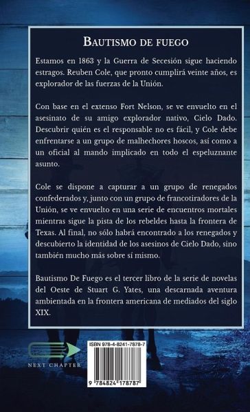 Estamos en 1863 y la Guerra de Secesión sigue haciendo estragos. Reuben Cole, que pronto cumplirá veinte años, es explorador de las fuerzas de la Unión. Con base en el extenso Fort Nelson, se ve envuelto en el asesinato de su amigo explorador nativo, Cielo Dado. Descubrir quién es el responsable no es fácil, y Cole debe enfrentarse a un grupo de malhechores hoscos, así como a un oficial al mando implicado en todo el espeluznante asunto. Cole se dispone a capturar a un grupo de renegados confederados y, junto con un grupo de francotiradores de la Unión, se ve envuelto en una serie de encuentros mortales mientras sigue la pista de los rebeldes hasta la frontera de Texas. Al final, no sólo habrá encontrado a los renegados y descubierto la identidad de los asesinos de Cielo Dado, sino también mucho más sobre sí mismo. Bautismo De Fuego es el tercer libro de la serie de novelas del Oeste de Stuart G. Yates, una descarnada aventura ambientada en la frontera americana de mediados del siglo XIX.