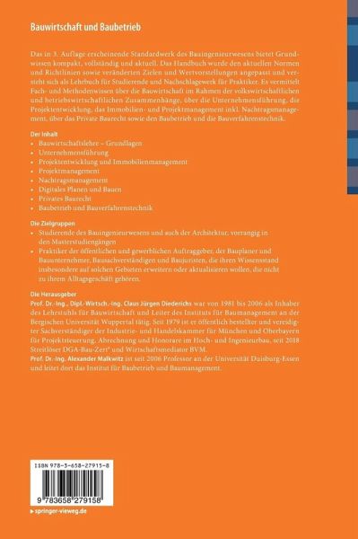 Prof. Dr.-Ing., Dipl.-Wirtsch.-Ing. Claus Jürgen Diederichs war von 1981 bis 2006 als Inhaber des Lehrstuhls für Bauwirtschaft und Leiter des Instituts für Baumanagement an der Bergischen Universität Wuppertal tätig. Seit 1979 ist er öffentlich bestellter und vereidigter Sachverständiger der Industrie- und Handelskammer für München und Oberbayern für Projektsteuerung, Abrechnung und Honorare im Hoch- und Ingenieurbau, seit 2018 Streitlöser DGA-Bau-Zert® und Wirtschaftsmediator BVM. Prof. Dr.-Ing. Alexander Malkwitz ist seit 2006 Professor an der Universität Duisburg-Essen und leitet dort das Institut für Baubetrieb und Baumanagement.
