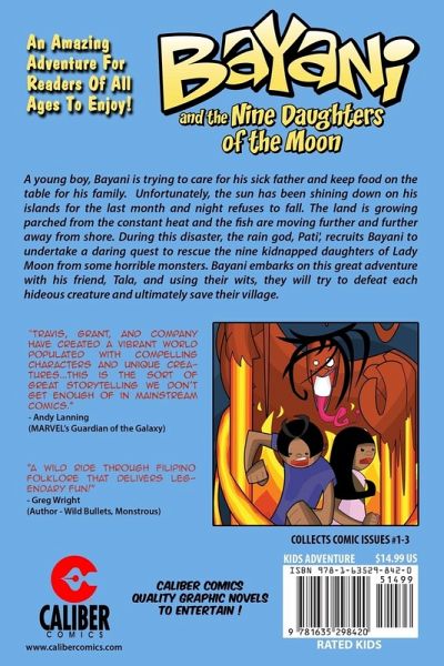 An Amazing Adventure Story for All Ages to Enjoy! A young boy, Bayani is trying to care for his sick father and keep food on the table for his family. Unfortunately, the sun has been shining down on his islands for the last month and night refuses to fall. The land is growing parched from the constant heat and the fish are moving further and further away from shore. During this disaster, the rain god, Pati', recruits Bayani to undertake a daring quest to rescue the nine kidnapped daughters of Lady Moon from some horrible monsters. Bayani embarks on this great adventure with his friend, Tala, and using their wits, they will try to defeat each hideous creature and ultimately save their village. Collects comic issues #1-3.