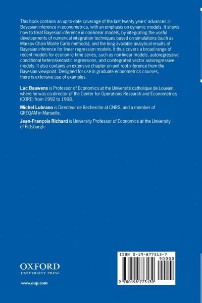 This book offers an up-to-date coverage of the basic principles and tools of Bayesian inference in econometrics, with an emphasis on dynamic models. It shows how to treat Bayesian inference in non linear models, by integrating the useful developments of numerical integration techniques based on simulations, and the long available analytical results of Bayesian inference for linear regression models. About the Series Advanced Texts in Econometrics is a distinguished and rapidly expanding series in which leading econometricians assess recent developments in such areas as stochastic probability, panel and time series data analysis, modeling, and cointegration. In both hardback and affordable paperback, each volume explains the nature and applicability of a topic in greater depth than possible in introductory textbooks or single journal articles. Each definitive work is formatted to be as accessible and convenient for those who are not familiar with the detailed primary literature.