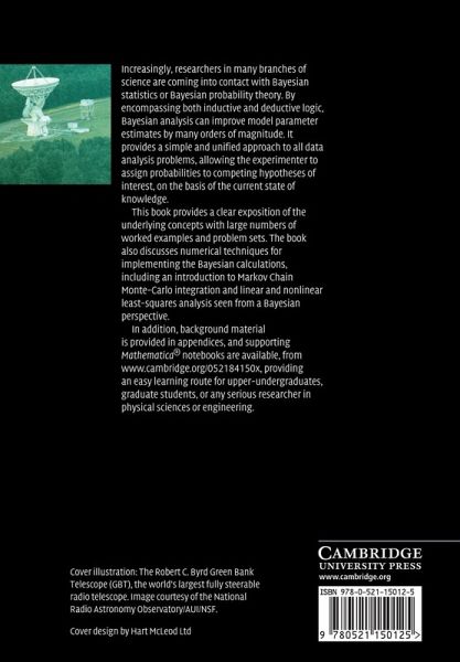 Bayesian inference provides a simple and unified approach to data analysis, allowing experimenters to assign probabilities to competing hypotheses of interest, on the basis of the current state of knowledge. By incorporating relevant prior information, it can sometimes improve model parameter estimates by many orders of magnitude. This book provides a clear exposition of the underlying concepts with many worked examples and problem sets. It also discusses implementation, including an introduction to Markov chain Monte-Carlo integration and linear and nonlinear model fitting. Particularly extensive coverage of spectral analysis (detecting and measuring periodic signals) includes a self-contained introduction to Fourier and discrete Fourier methods. There is a chapter devoted to Bayesian inference with Poisson sampling, and three chapters on frequentist methods help to bridge the gap between the frequentist and Bayesian approaches. Supporting Mathematica® notebooks with solutions to selected problems, additional worked examples, and a Mathematica tutorial are available at www.cambridge.org/9780521150125.