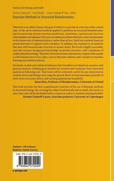 This book is an edited volume, the goal of which is to provide an overview of the current state-of-the-art in statistical methods applied to problems in structural bioinformatics (and in particular protein structure prediction, simulation, experimental structure determination and analysis). It focuses on statistical methods that have a clear interpretation in the framework of statistical physics, rather than ad hoc, black box methods based on neural networks or support vector machines. In addition, the emphasis is on methods that deal with biomolecular structure in atomic detail. The book is highly accessible, and only assumes background knowledge on protein structure, with a minimum of mathematical knowledge. Therefore, the book includes introductory chapters that contain a solid introduction to key topics such as Bayesian statistics and concepts in machine learning and statistical physics.