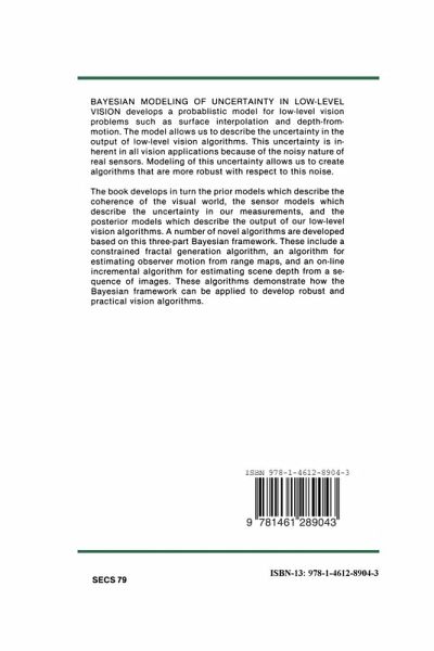Vision has to deal with uncertainty. The sensors are noisy, the prior knowledge is uncertain or inaccurate, and the problems of recovering scene information from images are often ill-posed or underconstrained. This research monograph, which is based on Richard Szeliski's Ph.D. dissertation at Carnegie Mellon University, presents a Bayesian model for representing and processing uncertainty in low level vision. Recently, probabilistic models have been proposed and used in vision. Sze liski's method has a few distinguishing features that make this monograph im portant and attractive. First, he presents a systematic Bayesian probabilistic estimation framework in which we can define and compute the prior model, the sensor model, and the posterior model. Second, his method represents and computes explicitly not only the best estimates but also the level of uncertainty of those estimates using second order statistics, i.e., the variance and covariance. Third, the algorithms developed are computationally tractable for dense fields, such as depth maps constructed from stereo or range finder data, rather than just sparse data sets. Finally, Szeliski demonstrates successful applications of the method to several real world problems, including the generation of fractal surfaces, motion estimation without correspondence using sparse range data, and incremental depth from motion.