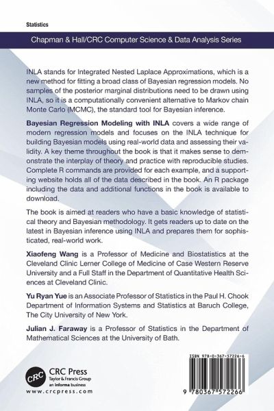 INLA stands for Integrated Nested Laplace Approximations, which is a new method for fitting a broad class of Bayesian regression models. No samples of the posterior marginal distributions need to be drawn using INLA, so it is a computationally convenient alternative to Markov chain Monte Carlo (MCMC), the standard tool for Bayesian inference. Bayesian Regression Modeling with INLA covers a wide range of modern regression models and focuses on the INLA technique for building Bayesian models using real-world data and assessing their validity. A key theme throughout the book is that it makes sense to demonstrate the interplay of theory and practice with reproducible studies. Complete R commands are provided for each example, and a supporting website holds all of the data described in the book. An R package including the data and additional functions in the book is available to download. The book is aimed at readers who have a basic knowledge of statistical theory and Bayesian methodology. It gets readers up to date on the latest in Bayesian inference using INLA and prepares them for sophisticated, real-world work. Xiaofeng Wang is Professor of Medicine and Biostatistics at the Cleveland Clinic Lerner College of Medicine of Case Western Reserve University and a Full Staff in the Department of Quantitative Health Sciences at Cleveland Clinic. Yu Ryan Yue is Associate Professor of Statistics in the Paul H. Chook Department of Information Systems and Statistics at Baruch College, The City University of New York. Julian J. Faraway is Professor of Statistics in the Department of Mathematical Sciences at the University of Bath.