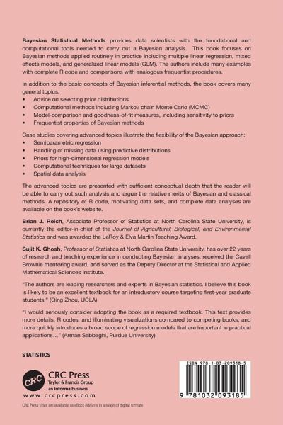 Bayesian Statistical Methods provides data scientists with the foundational and computational tools needed to carry out a Bayesian analysis. This book focuses on Bayesian methods applied routinely in practice including multiple linear regression, mixed effects models and generalized linear models (GLM). The authors include many examples with complete R code and comparisons with analogous frequentist procedures.