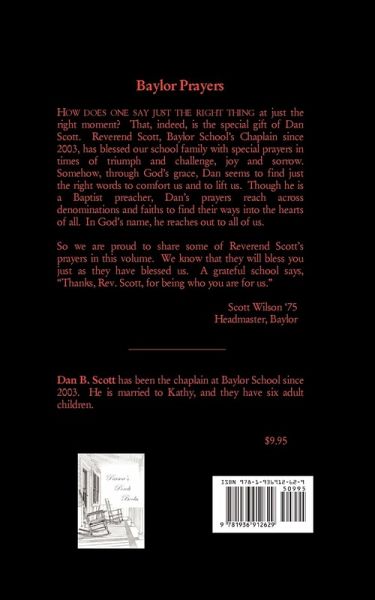 How does one say just the right thing at just the right moment? That, indeed, is the special gift of Dan Scott. Reverend Scott, Baylor School's Chaplain since 2003, has blessed our school family with special prayers in times of triumph and challenge, joy and sorrow. Somehow, through God's grace, Dan seems to find just the right words to comfort us and to lift us. Though he is a Baptist preacher, Dan's prayers reach across denominations and faiths to find their ways into the hearts of all. In God's name, he reaches out to all of us. So we are proud to share some of Reverend Scott's prayers in this volume. We know that they will bless you just as they have blessed us. A grateful school says, "Thanks, Rev. Scott, for being who you are for us." Scott Wilson '75 Headmaster