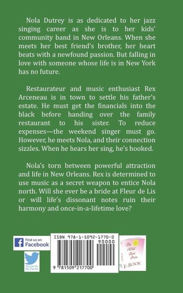 Nola Dutrey is as dedicated to her jazz singing career as she is to her kids' community band in New Orleans. When she meets her best friend’s brother, her heart beats with a newfound passion. But falling in love with someone whose life is in New York has no future. Restaurateur and music enthusiast Rex Arceneau is in town to settle his father’s estate. He must get the financials into the black before handing over the family restaurant to his sister. To reduce expenses—the weekend singer must go. However, he meets Nola, and their connection sizzles. When he hears her sing, he’s hooked. Nola’s torn between powerful attraction and life in New Orleans. Rex is determined to use music as a secret weapon to entice Nola north. Will she ever be a bride at Fleur de Lis or will life’s dissonant notes ruin their harmony and once-in-a-lifetime love?
