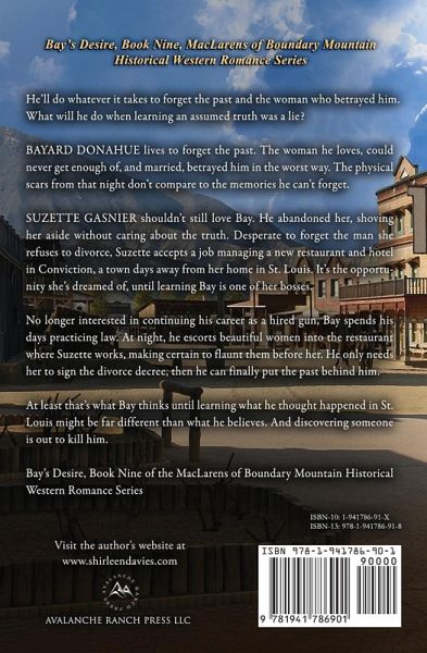 He'll do whatever it takes to forget the past and the woman who betrayed him. What will he do when learning an assumed truth was a lie? Bay's Desire, Book Nine, MacLarens of Boundary Mountain Historical Western Romance Series Bayard Donahue lives to forget the past. The woman he loves, could never get enough of, and married, betrayed him in the worst way. The physical scars from that night don't compare to the memories he can't forget. Suzette Gasnier shouldn't still love Bay. He abandoned her, shoving her aside without caring about the truth. Desperate to forget the man she refuses to divorce, Suzette accepts a job managing a new restaurant and hotel in Conviction, a town days away from her home in St. Louis. It's the opportunity she's dreamed of, until learning Bay is one of her bosses. No longer interested in continuing his career as a hired gun, Bay spends his days practicing law. At night, he escorts beautiful women into the restaurant where Suzette works, making certain to flaunt them before her. He only needs her to sign the divorce decree, then he can finally put the past behind him. At least that's what Bay thinks until learning what he thought happened in St. Louis might be far different than what he believes. And discovering someone is out to kill him. Bay's Desire, book nine in the MacLarens of Boundary Mountain Historical Western Romance Series, is a stand-alone, full-length novel with an HEA and no cliffhanger.