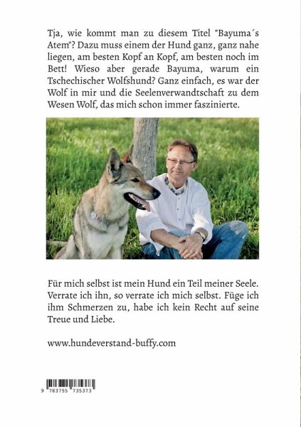 Tja, wie kommt man zu diesem Titel "Bayuma´s Atem"? Dazu muss einem der Hund ganz, ganz nahe liegen, am besten Kopf an Kopf, am besten noch im Bett! Wieso aber gerade Bayuma, warum ein Tschechischer Wolfshund? Ganz einfach, es war der Wolf in mir und die Seelenverwandtschaft zu dem Wesen Wolf, das mich schon immer faszinierte.Für mich selbst ist mein Hund ein Teil meiner Seele. Verrate ich ihn, so verrate ich mich selbst. Füge ich ihm Schmerzen zu, habe ich kein Recht auf seine Treue und Liebe.www.hundeverstand-buffy.com