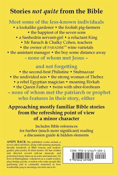 Stories not quite from the Bible; featuring characters with bit-parts, like the men who ran the clifftop pigfarm, the guests at Herod's birthday party, the look-alike gardener, Simon of Cyrene, Joseph of Aramathea and many more. In each case, their lives were turned upside down by the Messiah, despite not meeting him (or not realising who he was when they briefly crossed his path). With a variety of styles and creative economies with possible truths, these tales consider how individuals thought about the Saviour. Also includes bonus material: They didn't meet Jesus the early years, considering people who didn't meet famous Old Testament figures, with similarly life-changing effect. Examples include folk who didn't meet Moses or Ezekiel or Solomon or Noah's son Shem, Daniel or King David.