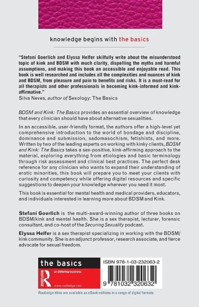 "Stefani Goerlich and Elyssa Helfer skilfully write about the misunderstood topic of kink and BDSM with much clarity, dispelling the myths and harmful assumptions, and making this book an accessible and enjoyable read. This book is well-researched and includes all the complexities and nuances of kink and BDSM, from pleasure and pain to benefits and risks. It is a must-read for all therapists and other professionals in becoming kink-informed and kink-affirmative."