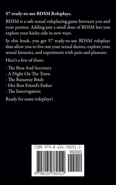 57 ready-to-use BDSM Roleplays. BDSM is a safe sexual roleplaying game between you and your partner. Adding just a small dose of BDSM lets you explore your kinky side in new ways. In this book, you get 57 ready-to-use BDSM roleplays that allow you to live out your sexual desires, explore your sexual fantasies, and experiment with pain and pleasure. Here's a few of them: - The Boss And Secretary - A Night On The Town - The Runaway Bride - Her Best Friend's Father - The Interrogation Ready for some roleplays?