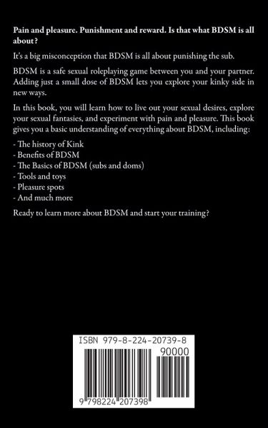 Pain and pleasure. Punishment and reward. Is that what BDSM is all about? It's a big misconception that BDSM is all about punishing the sub. BDSM is a safe sexual roleplaying game between you and your partner. Adding just a small dose of BDSM lets you explore your kinky side in new ways. In this book, you will learn how to live out your sexual desires, explore your sexual fantasies, and experiment with pain and pleasure. This book gives you a basic understanding of everything about BDSM, including: - The history of Kink - Benefits of BDSM - The Basics of BDSM (subs and doms) - Tools and toys - Pleasure spots - And much more Ready to learn more about BDSM and start your training?