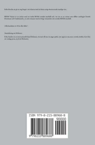 Erika föreslår att gå ett steg längre i sin relation med sin bästa sexiga dominerande manliga vän... BDSM Vänner är en roman med ett starkt BDSM erotiskt innehåll och i sin tur en ny roman som tillhör samlingen Erotisk Dominans och Underkastelse, en serie romaner med ett högt romantiskt och erotiskt BDSM-innehåll. (Alla karaktärer är 18 år eller äldre) Anmärkning om författare: Erika Sanders är en internationellt känd författare, översatt till mer än tjugo språk, som signerar sina mest erotiska skrifter, bort från sin vanliga prosa, med sitt flicknamn.