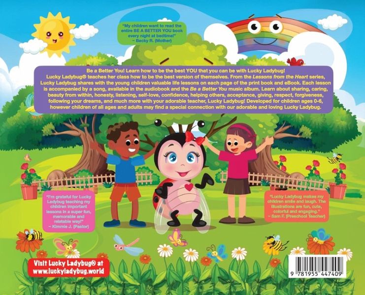 Be a Better You! Learn how to be the best YOU that you can be with Lucky Ladybug! Lucky Ladybug(R) teaches her class how to be the best version of themselves. From the Lessons from the Heart series, Lucky Ladybug shares with the young children valuable life lessons on each page of the print book and eBook. Each lesson is accompanied by a song, available in the audiobook and the Be a Better You music album. Learn about sharing, caring, beauty from within, honesty, listening, self-love, confidence, helping others, acceptance, giving, respect, forgiveness, following your dreams, and much more with your adorable teacher, Lucky Ladybug! Developed for children ages 0-6, however children of all ages and adults may find a special connection with our adorable and loving Lucky Ladybug.